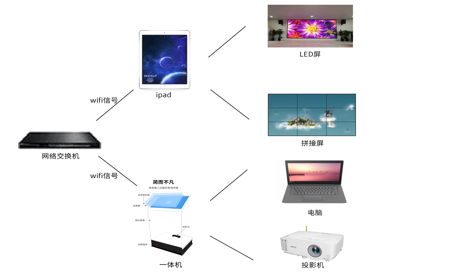 飞屏软件由网络交换机、IPAD、一体机、LED屏、拼接屏、电脑和投影机组成。